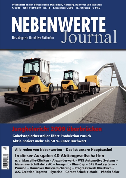 Die Vorzugsaktie der Jungheinrich AG notiert auf dem Niveau des Jahres 2003. Mit einem KGV von 3.5, einem Börsenwert von € 135 Mio. für die Vorzüge scheint die Börse nunmehr stark nach unten zu übertreiben. Wir erwarten keinen massiven operativen Ergebniseinbruch.