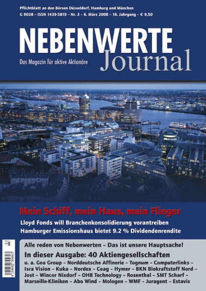 In NJ 3/07 bezeichneten wir die Aktie der Lloyd Fonds AG bei einem Kurs von € 17.60 vor allem unter Renditegesichtspunkten als interessant. Wir erwarten auf Grund der neu konzipierten, innovativen Produkte, dass die hohe Dividendenrendite von 9.2 % keine Eintagsfliege bleiben wird. Das 2008er KGV liegt bei moderaten 7.8. Unsere positive Einschätzung behalten wir bei, obwohl die Börse die gute Unternehmensentwicklung bisher nicht ausreichend berücksichtigt.
